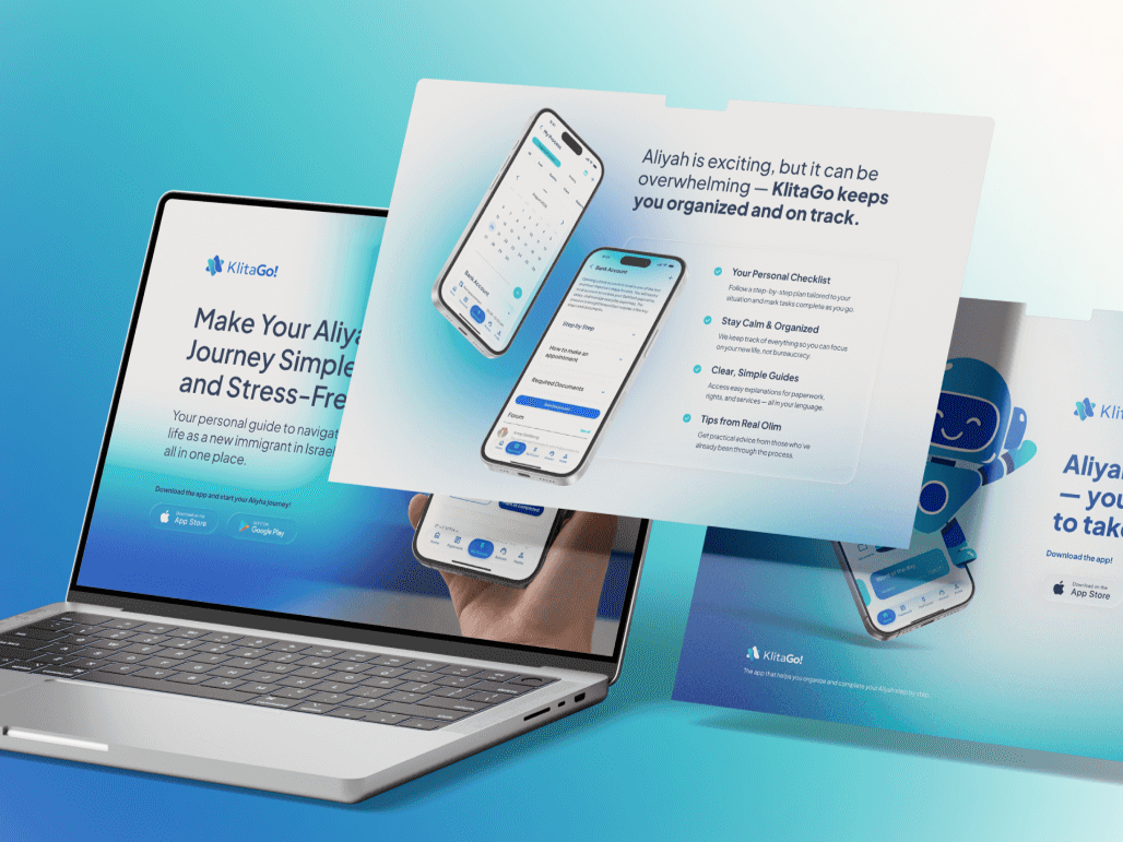 This project extends the KlitaGo experience into a full desktop version, allowing users to manage their Aliyah processes from any device. The website includes a one-page homepage designed to introduce the app, highlight its core features, and guide visitors toward the main calls-to-action: downloading the mobile app or logging in. Once users click “Log In,” they access their personal dashboard, where they can view and manage all their bureaucratic processes, upload documents, and track their progress—just like in the mobile app. The challenge was to adapt the same clarity and simplicity of the mobile experience to a larger interface while maintaining the brand’s visual identity and user-friendly flow.